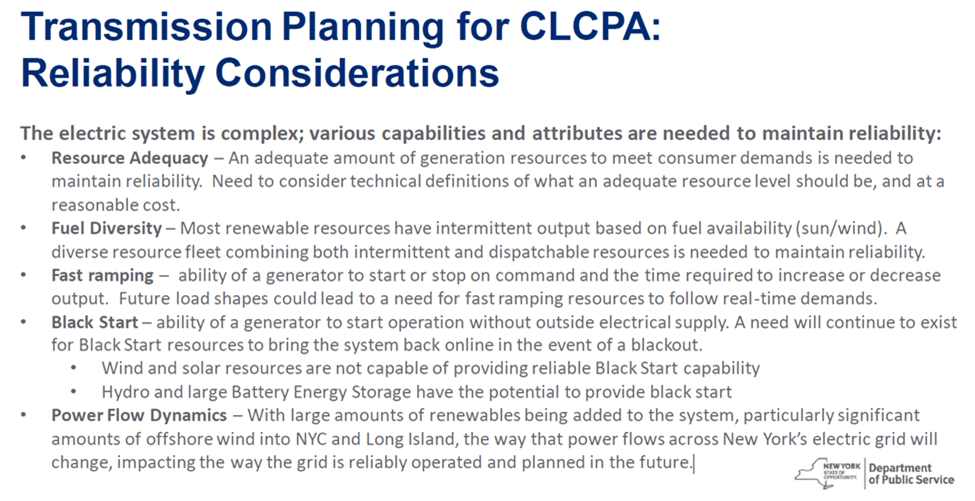 There are two independent organizations responsible for New York reliability: New York State Reliability Council (NYSRC) and New York State Independent Operator (NYISO). The NYSRC is a Federal Energy Regulatory Council (FERC) approved entity responsible for “the promulgation of reliability standards for New York, which are mandatory requirements for the New York Independent System Operator”. The Climate Action Council presentation included a slide describing what is needed to operate the electric system reliably. The takeaway message of the NYSRC to the Climate Action Council was: