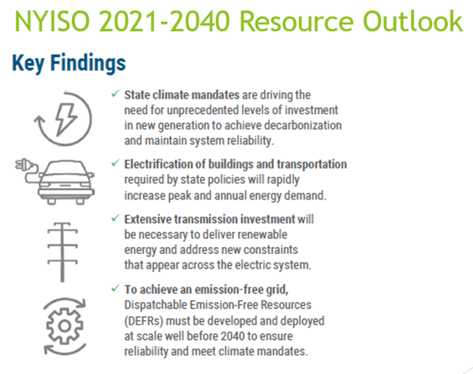 The NYISO system planning process has added a new component to address the Climate Act. They evaluate a longer planning horizon than was included previously. The 2021-2040 System & Resource Outlook can be downloaded from NYISO and a datasheet summary of key takeaways of the Outlook report is also available. The following figure shows four key findings.